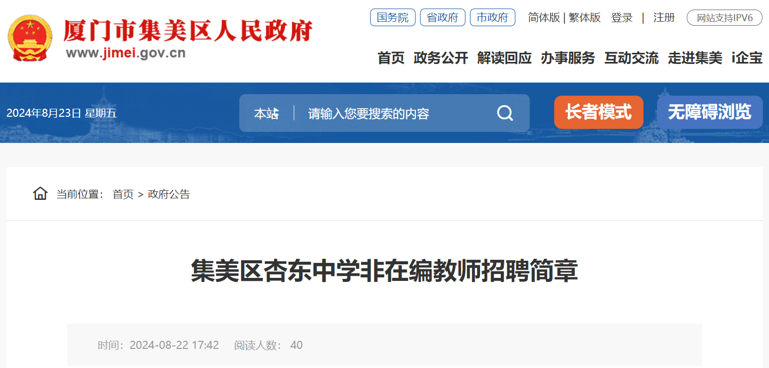 2024福建廈門集美區(qū)杏東中學非在編教師招聘簡章已發(fā)布,報名時間:2024年8月22日至2024年8月29日。現(xiàn)將招聘公告原文發(fā)布如下: