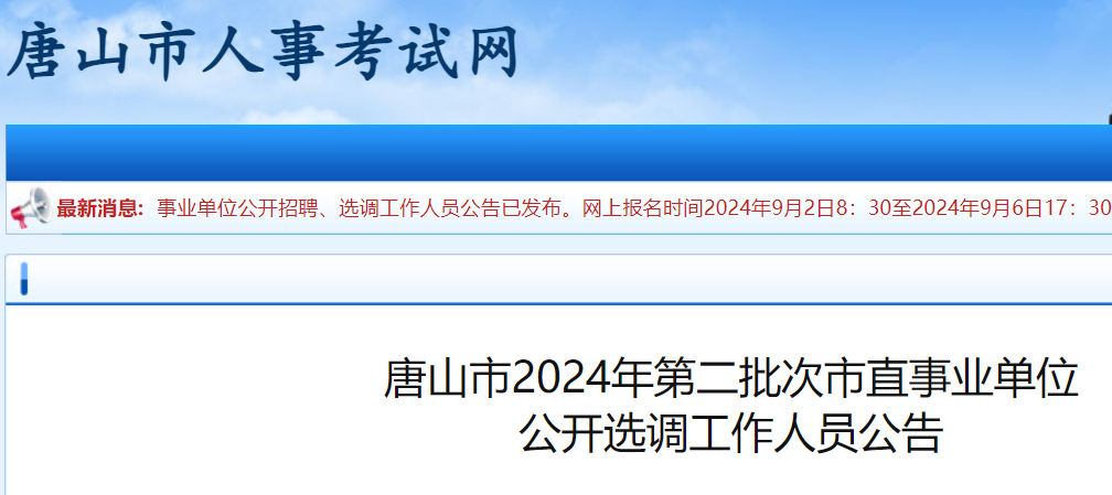 為滿足唐山市市直事業(yè)單位工作需要,根據(jù)《事業(yè)單位人事管理?xiàng)l例》《河北省機(jī)關(guān)事業(yè)單位干部調(diào)配辦法》等有關(guān)規(guī)定,經(jīng)研究決定,組織開(kāi)展2024年第二批次市直事業(yè)單位公開(kāi)選調(diào)工作人員?,F(xiàn)公告如下: