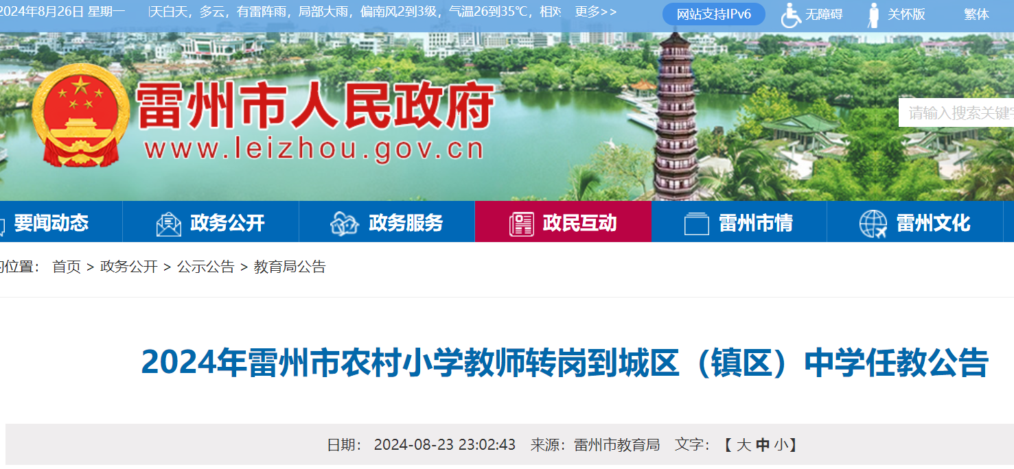 2024年廣東湛江雷州市農(nóng)村小學(xué)教師轉(zhuǎn)崗到城區(qū)(鎮(zhèn)區(qū))中學(xué)任教公告已發(fā)布,報(bào)名時(shí)間:8月25日至26日。現(xiàn)將招聘公告原文發(fā)布如下: