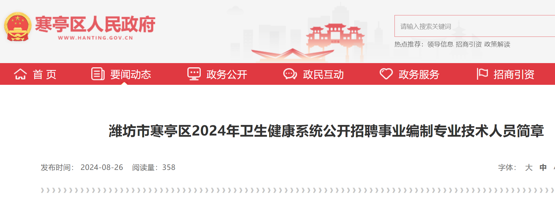2024年山東濰坊市寒亭區(qū)衛(wèi)生健康系統(tǒng)公開招聘事業(yè)編制專業(yè)技術(shù)人員簡(jiǎn)章已發(fā)布,報(bào)名時(shí)間:2024年9月4日09:00—9月12日17:00?,F(xiàn)將招聘公告原文發(fā)布如下: