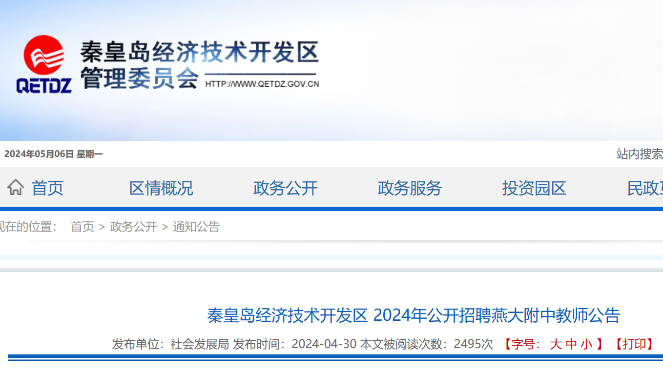 2024年河北秦皇島經(jīng)濟(jì)技術(shù)開(kāi)發(fā)區(qū)招聘燕大附中教師公告已發(fā)布,報(bào)名時(shí)間為2024年5月7日上午9點(diǎn)至2024年5月9日下午5點(diǎn)?,F(xiàn)將招聘公告原文發(fā)布如下: