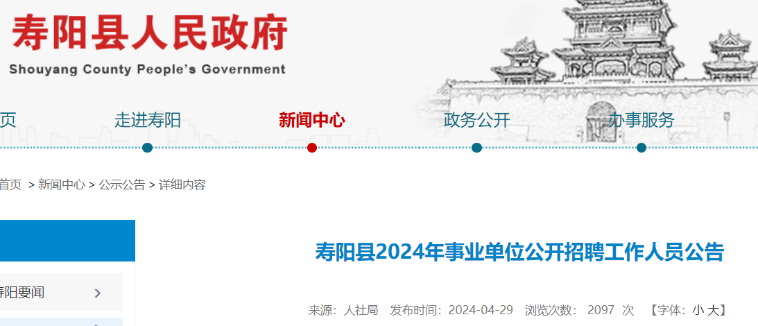 壽陽縣事業(yè)單位公開招聘工作領(lǐng)導(dǎo)組制定公開招聘實(shí)施方案,報(bào)晉中市委組織部、晉中市人力資源和社會(huì)保障局備案后,2024年4月29日在壽陽縣政府(中國壽陽)http://www.shouyang.gov.cn網(wǎng)站發(fā)布招聘公告。