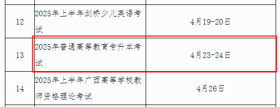 根據(jù)廣西招生考試院公布的《2025年廣西招生考試院考試日歷》了解到,2025年廣西欽州普通高等教育專升本考試時(shí)間已公布,考試時(shí)間為4月23日-24日。具體如下: