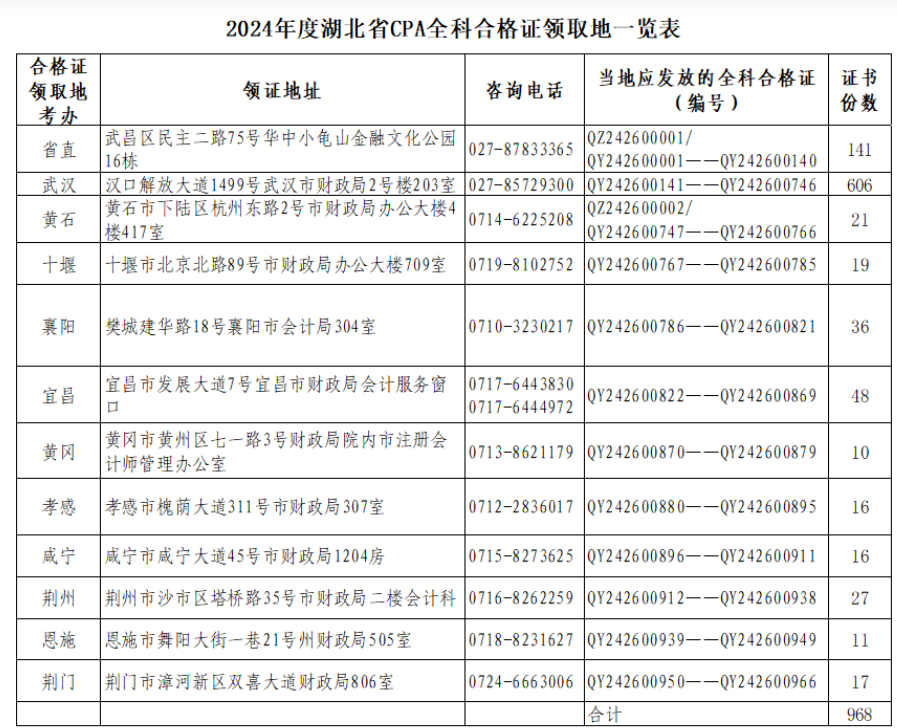 全省全科合格證紙質(zhì)證書已按照考生報名時所選的“證書領(lǐng)取地”分發(fā)到各市州考辦。所有全科合格考生均可到所屬考辦現(xiàn)場領(lǐng)取紙質(zhì)版,省直及武漢地區(qū)可選擇現(xiàn)場領(lǐng)取或郵寄領(lǐng)取任一方式?!白C書領(lǐng)取地”為其他市州的考生,請咨詢當(dāng)?shù)乜嫁k有關(guān)領(lǐng)證安排。各考辦信息詳見下表《2024年度湖北省CPA全科合格證領(lǐng)取地一覽表》,考生可參照表中列示的各考辦發(fā)放的全科合格證號碼段查詢本人“證書領(lǐng)取地”,本人攜帶身份證原件至現(xiàn)場領(lǐng)取。