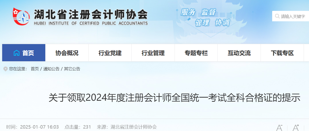 小編根據(jù)湖北省財政廳發(fā)布”關(guān)于領(lǐng)取2024年度注冊會計師全國統(tǒng)一考試全科合格證的提示“得知,2024年湖北注冊會計師全國統(tǒng)一考試全科合格證領(lǐng)取時間2025年1月1日起,詳情如下: