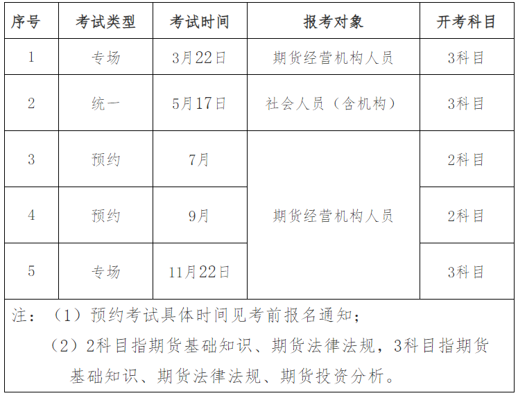 3.預(yù)約考試擬舉辦2次,考試日期擬定7月、9月(具體考試日期見(jiàn)考前報(bào)名通知),面向期貨經(jīng)營(yíng)機(jī)構(gòu)報(bào)考,開(kāi)考期貨基礎(chǔ)知識(shí)、期貨法律法規(guī)兩個(gè)科目,在全國(guó)部分城市舉辦。