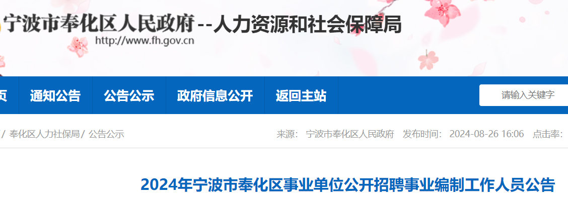 小編根據(jù)寧波市奉化區(qū)人力資源和社會(huì)保障局發(fā)布”2024年寧波市奉化區(qū)事業(yè)單位公開(kāi)招聘事業(yè)編制工作人員公告“得知,2024年浙江寧波市奉化區(qū)事業(yè)單位公開(kāi)招聘事業(yè)編制工作人員83人,報(bào)名時(shí)間為9月4日至9月6日。