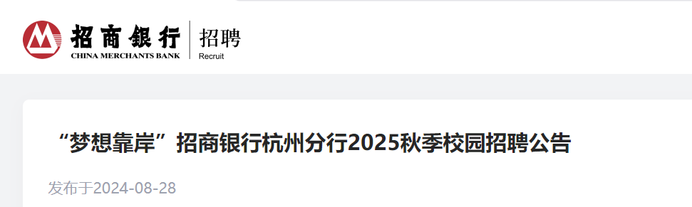 2025秋季“夢(mèng)想靠岸”招商銀行浙江杭州分行校園招聘公告已發(fā)布,簡歷投遞時(shí)間:即日起截至10月9日24:00(北京時(shí)間)?,F(xiàn)將招聘公告原文發(fā)布如下: