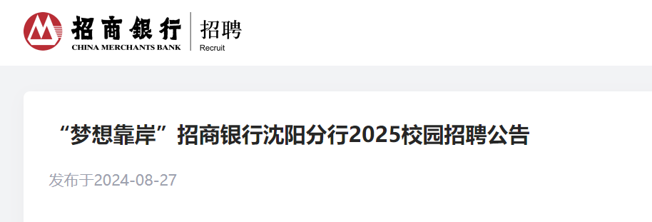 2025“夢想靠岸”招商銀行遼寧沈陽分行校園招聘公告已發(fā)布,報名通道長期開放,首批報名截止時間為2024年10月9日(周三)。現(xiàn)將招聘公告原文發(fā)布如下:
