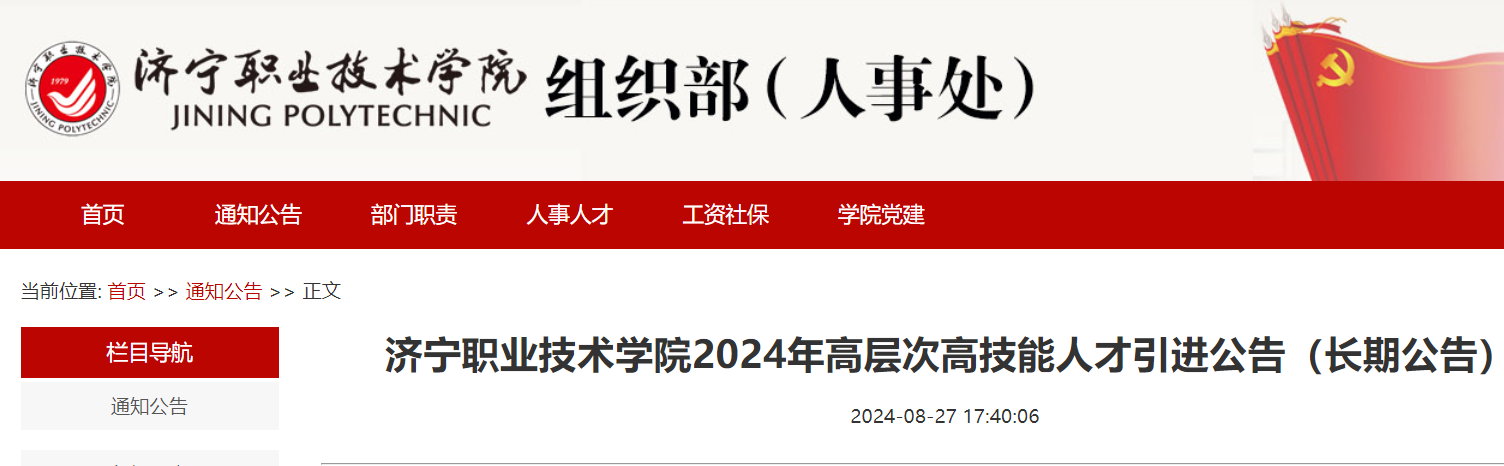 2024年山東濟(jì)寧職業(yè)技術(shù)學(xué)院高層次高技能人才引進(jìn)公告(長(zhǎng)期公告)已發(fā)布,此次引進(jìn)崗位為長(zhǎng)期引進(jìn),自本公告發(fā)布之日起7個(gè)工作日后,學(xué)院根據(jù)崗位報(bào)名情況,不定期啟動(dòng)面試、考察、體檢等程序,崗位招滿即止,未招滿的崗位報(bào)名有效期至2024年12月31日?,F(xiàn)將招聘公告原文發(fā)布如下: