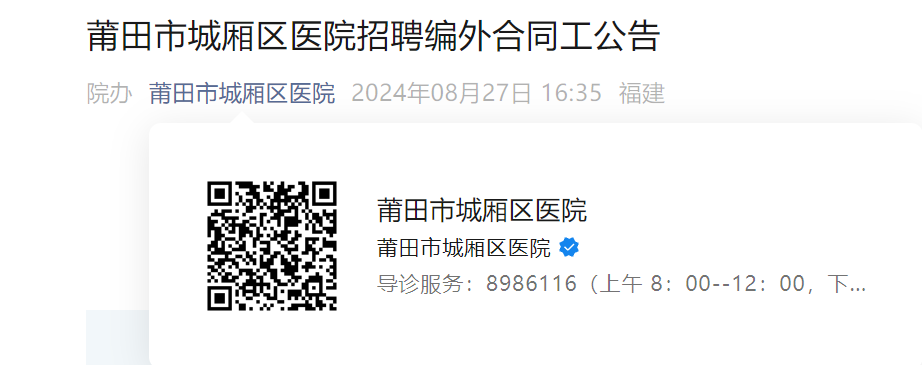 2024年福建莆田市城廂區(qū)醫(yī)院招聘編外合同工公告已發(fā)布,報(bào)名時(shí)間:2024年8月27日-2024年9月8日,上午8:00–11:30、下午14:30-17:00?,F(xiàn)將招聘公告原文發(fā)布如下: