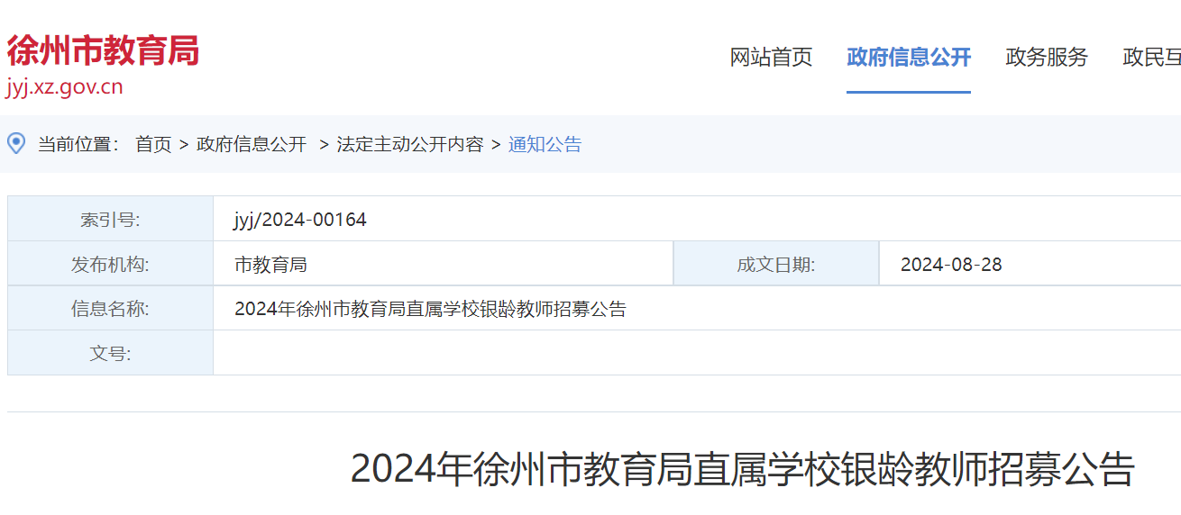 2024年江蘇徐州市教育局直屬學(xué)校銀齡教師招募公告已發(fā)布,報(bào)名時(shí)間:2024年8月30日9:00-17:00?,F(xiàn)將招聘公告原文發(fā)布如下: