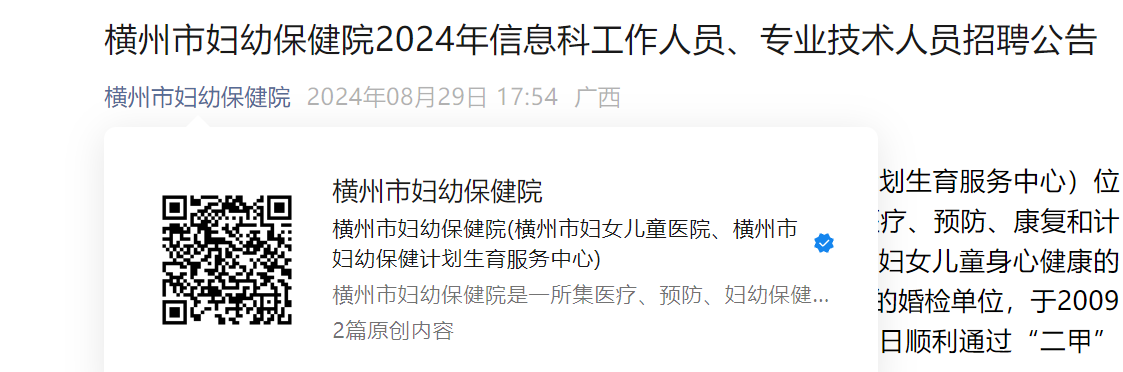 2024廣西南寧橫州市婦幼保健院信息科工作人員、專業(yè)技術(shù)人員招聘公告已發(fā)布,信息統(tǒng)計(jì)科工作人員報(bào)名截止時(shí)間為2024年9月5日;醫(yī)師崗位長期有效?,F(xiàn)將招聘公告原文發(fā)布如下: