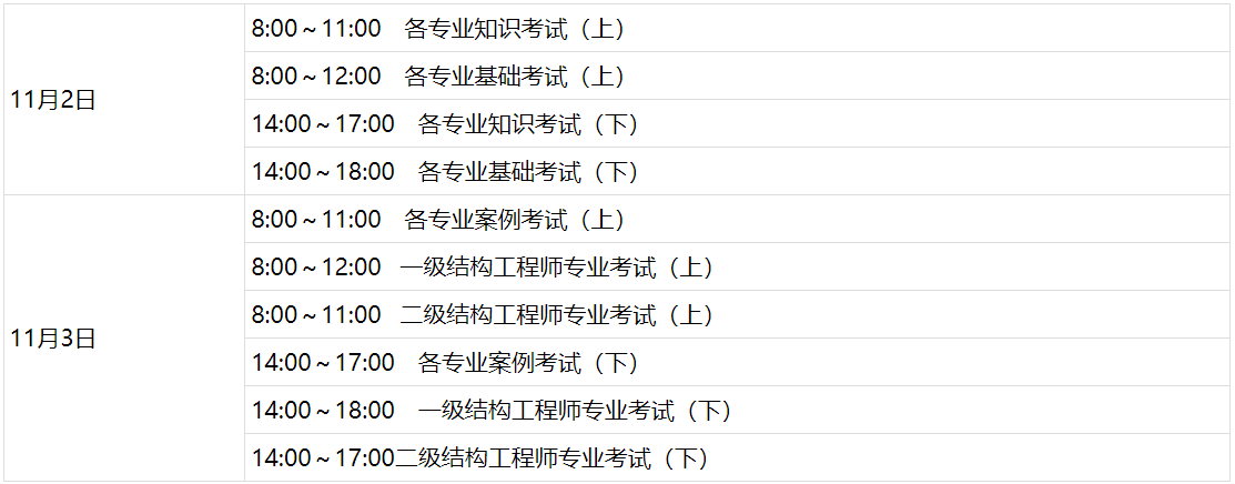 2024年度全國(guó)勘察設(shè)計(jì)注冊(cè)工程師執(zhí)業(yè)資格考試定于2024年11月2、3日舉行,考試科目及具體時(shí)間安排如下: