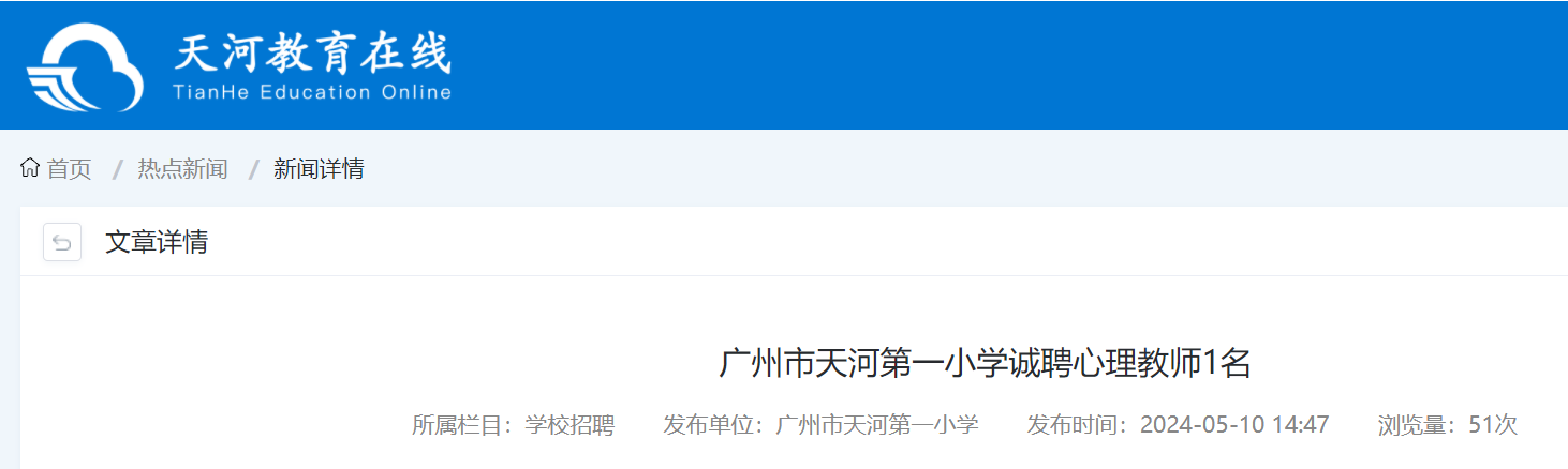2024廣東廣州市天河第一小學(xué)誠聘心理教師1名,報名時間:即日起至2024年5月15日?,F(xiàn)將招聘公告原文發(fā)布如下: