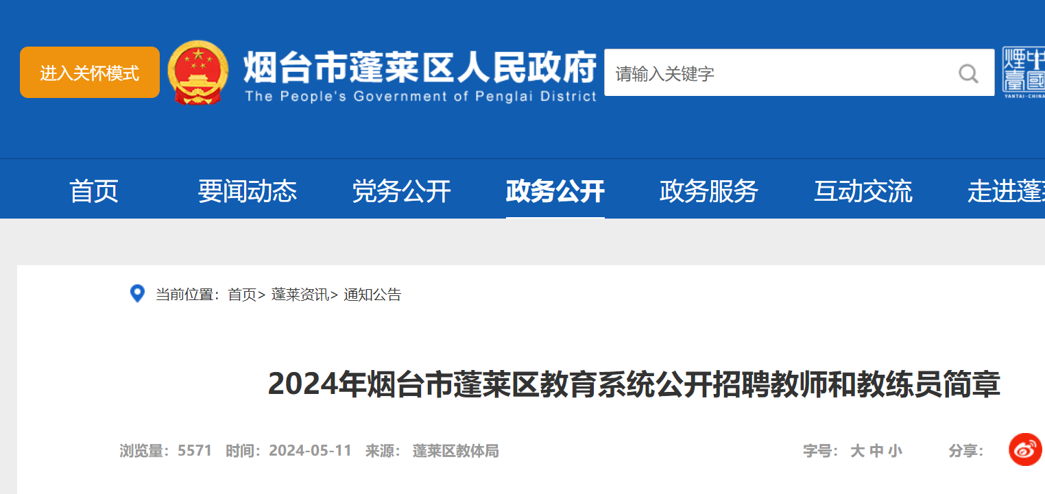 招聘通知、信息、公告和公示網站:煙臺市蓬萊區(qū)政府網站(http://www.penglai.gov.cn/)