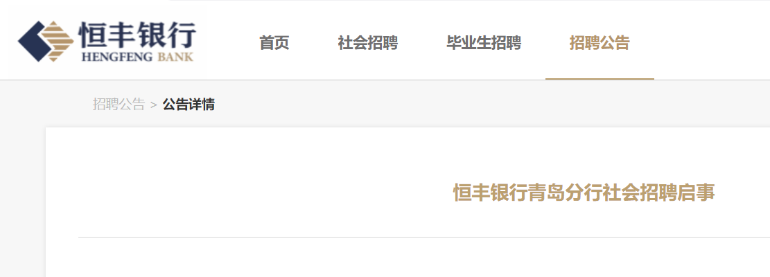 2024恒豐銀行山東青島分行社會招聘啟事已發(fā)布,應(yīng)聘者對個人填報信息的真實性負(fù)責(zé),如與事實不符,恒豐銀行有權(quán)取消錄用資格?,F(xiàn)將招聘公告原文發(fā)布如下: