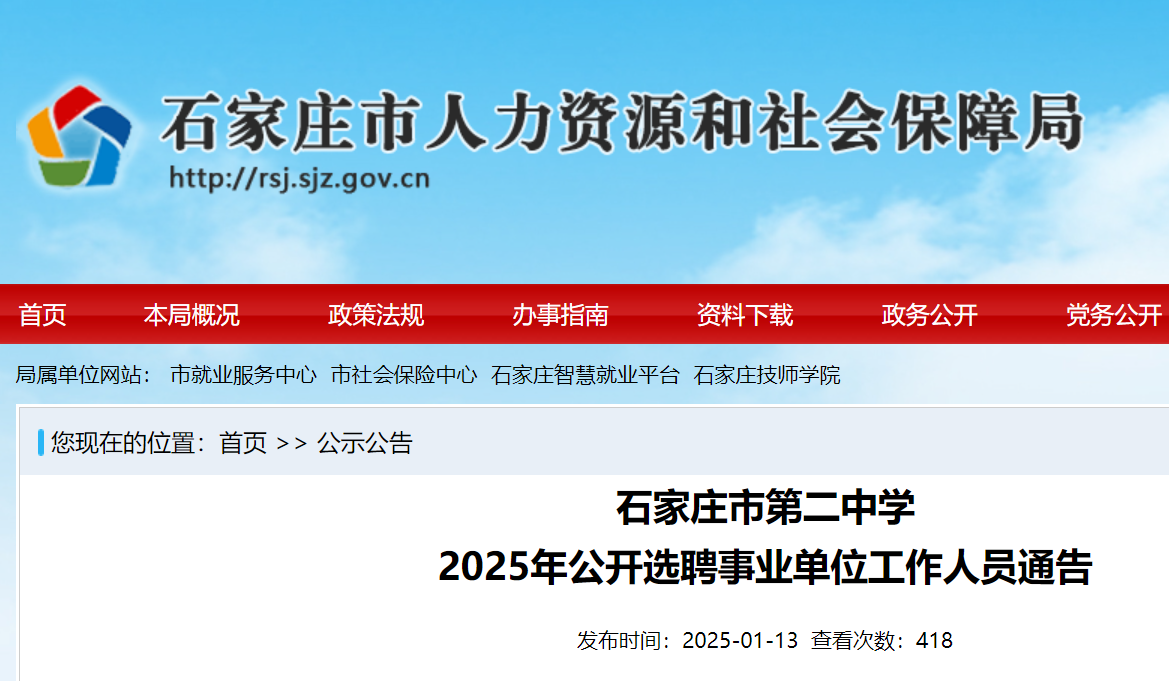 本次選聘通過石家莊市人力資源和社會(huì)保障局(http://rsj.sjz.gov.cn)、石家莊市第二中學(xué)(https://www.sjzez.com/)發(fā)布公告。