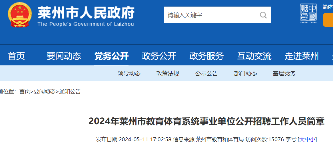 為進(jìn)一步加強(qiáng)教師隊(duì)伍建設(shè),按照《事業(yè)單位人事管理?xiàng)l例》(國務(wù)院令第652號(hào))、《山東省事業(yè)單位公開招聘人員實(shí)施辦法》(魯人社規(guī)〔2022〕2號(hào))等規(guī)定,萊州市教育體育系統(tǒng)事業(yè)單位面向社會(huì)公開招聘工作人員,現(xiàn)公告如下。