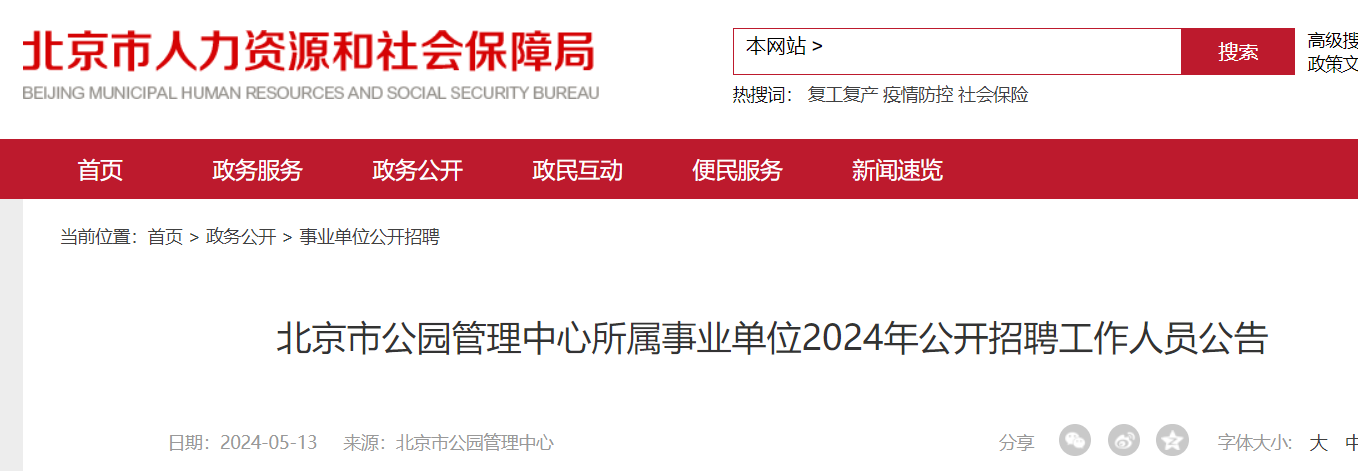 小編根據(jù)北京市人力資源和社會(huì)保障局發(fā)布“北京市公園管理中心所屬事業(yè)單位2024年公開招聘工作人員公告”得知,2024北京市公園管理中心所屬事業(yè)單位招聘111人,報(bào)名時(shí)間為2024年5月21日至5月22日。