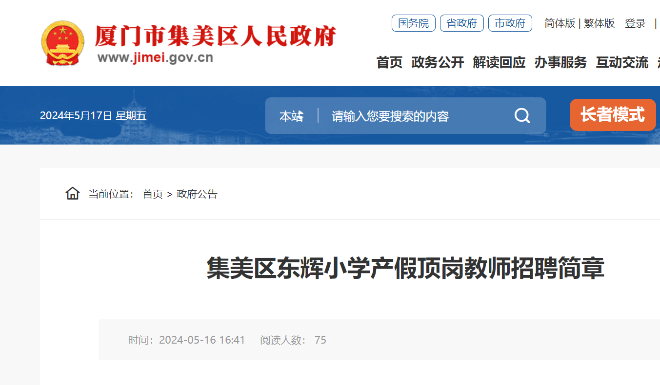 2024福建廈門集美區(qū)東輝小學(xué)產(chǎn)假頂崗教師招聘簡章已發(fā)布,報(bào)名時(shí)間:即日起至2024年6月5日?,F(xiàn)將招聘公告原文發(fā)布如下: