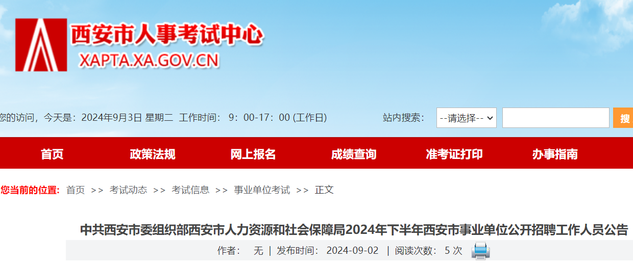 本次招聘在西安人事考試網(wǎng)(xapta.xa.gov.cn)發(fā)布公告。