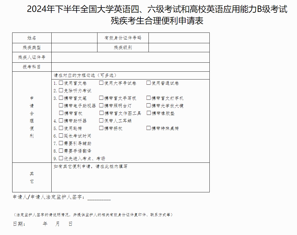 報(bào)名參加CET或英語B級考試并申請?zhí)峁┖侠肀憷臍埣部忌?,?yīng)于9月23日前向所在高校提交《2024年下半年全國大學(xué)英語四、六級考試和高校英語應(yīng)用能力B級考試殘疾考生合理便利申請表》、本人有效身份證件和《中華人民共和國殘疾人證》的復(fù)印件(或掃描件)等材料提交考點(diǎn)。如由法定監(jiān)護(hù)人代辦,還應(yīng)提供法定監(jiān)護(hù)人的有效身份證件復(fù)印件(或掃描件)及聯(lián)系方式等。