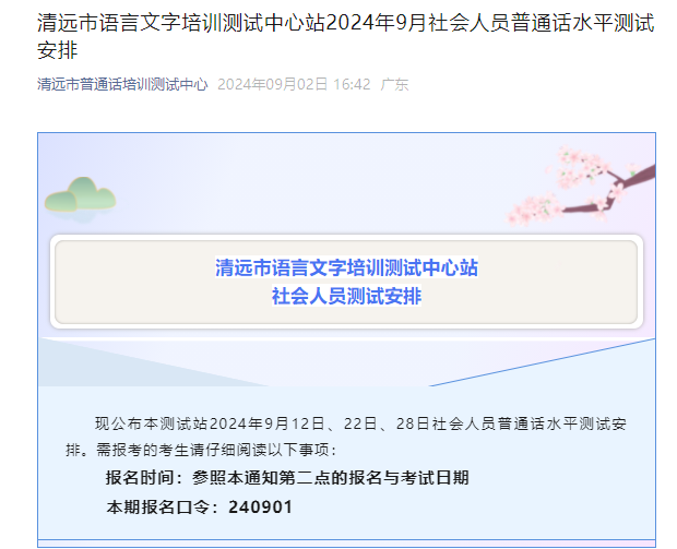 從清遠市普通話培訓測試中心獲悉,2024年9月廣東清遠普通話報名時間為9月5日-9月26日,考試時間為9月12、22、28日,具體詳情如下: