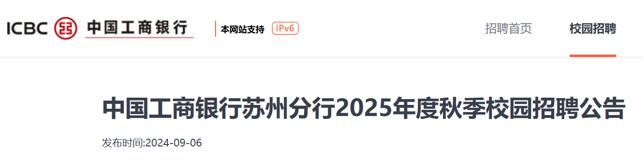 2025年度秋季中國(guó)工商銀行江蘇蘇州分行校園招聘公告已發(fā)布,網(wǎng)上報(bào)名時(shí)間為2024年9月6日-10月10日。現(xiàn)將招聘公告原文發(fā)布如下: