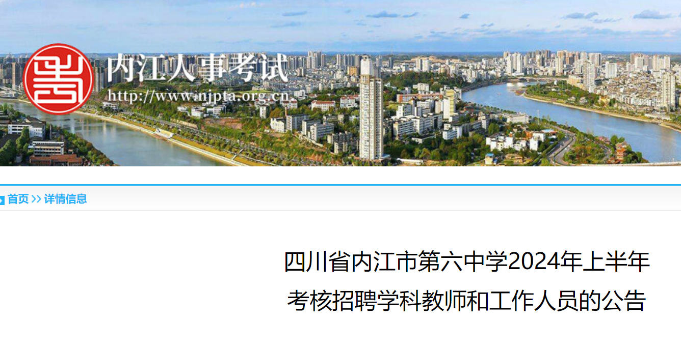 2024年上半年四川省內(nèi)江市第六中學(xué)考核招聘學(xué)科教師和工作人員公告已發(fā)布,報(bào)名時(shí)間:2024年5月24日9:00—2024年6月5日18:00?,F(xiàn)將招聘公告原文發(fā)布如下: