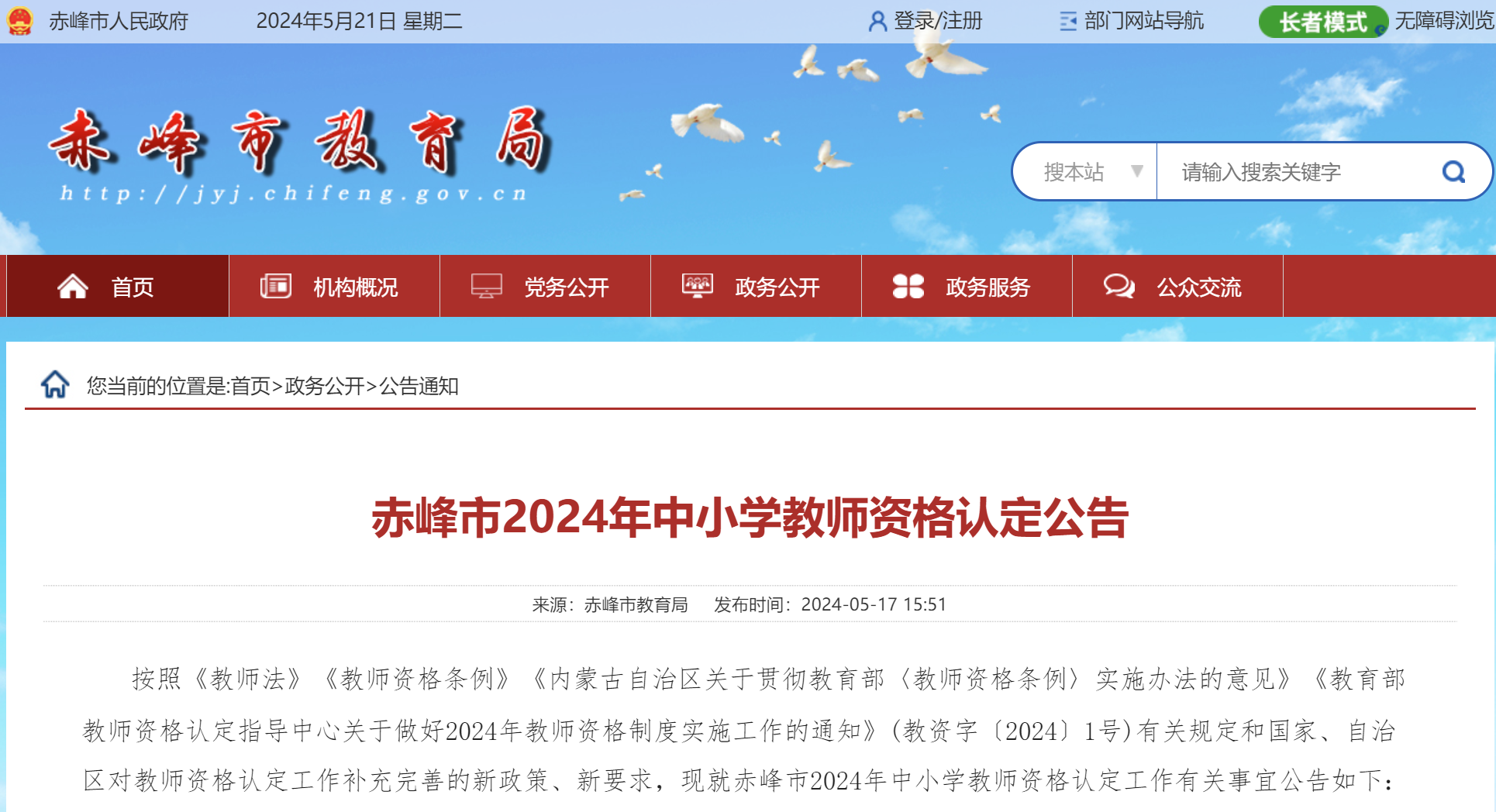 按照《教師法》《教師資格條例》《內蒙古自治區(qū)關于貫徹教育部〈教師資格條例〉實施辦法的意見》《教育部教師資格認定指導中心關于做好2024年教師資格制度實施工作的通知》(教資字〔2024〕1號)有關規(guī)定和國家、自治區(qū)對教師資格認定工作補充完善的新政策、新要求,現(xiàn)就赤峰市2024年中小學教師資格認定工作有關事宜公告如下: