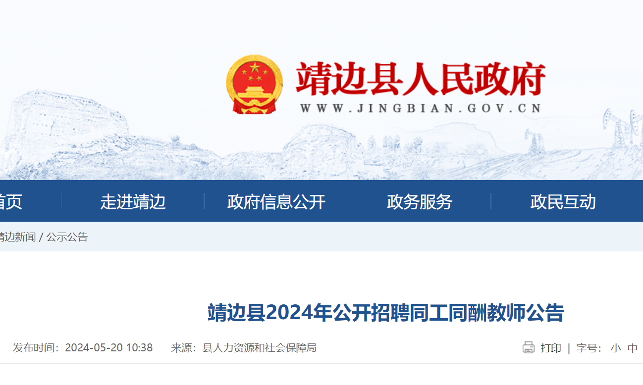 2024年陜西榆林靖邊縣公開招聘同工同酬教師公告已發(fā)布,報名時間:2024年5月27日08:00至6月5日18:00(周六、周日不休息)?,F(xiàn)將招聘公告原文發(fā)布如下: