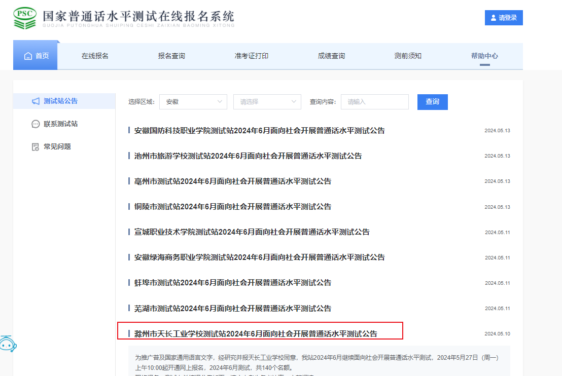 為推廣普及國(guó)家通用語言文字,經(jīng)研究并報(bào)天長(zhǎng)工業(yè)學(xué)校同意,我站2024年6月繼續(xù)面向社會(huì)開展普通話水平測(cè)試,2024年5月27日(周一)上午10:00起開通網(wǎng)上報(bào)名,2024年6月測(cè)試,共140個(gè)名額。