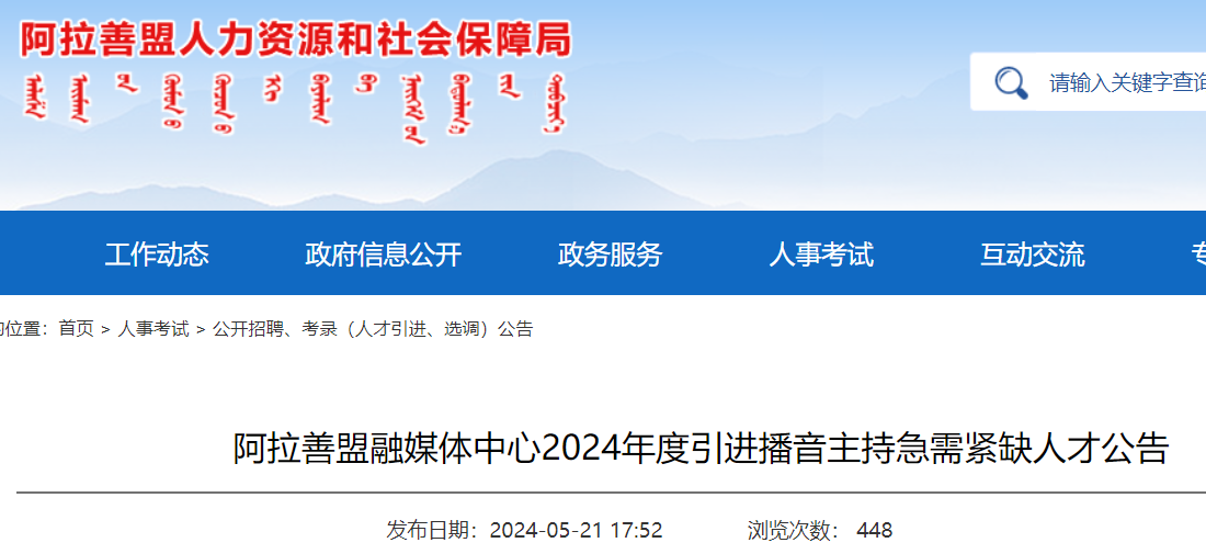 根據(jù)《事業(yè)單位公開招聘人員暫行規(guī)定》《內(nèi)蒙古自治區(qū)事業(yè)單位公開招聘人員辦法》等有關(guān)規(guī)定,現(xiàn)將阿拉善盟融媒體中心2024年度引進(jìn)播音主持急需緊缺人才事項(xiàng)公告如下。