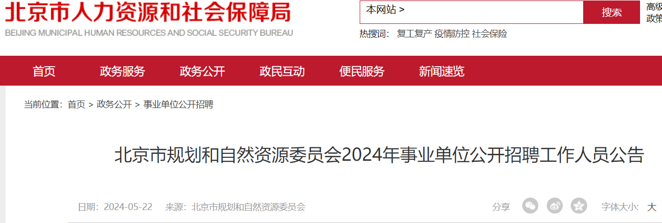小編根據(jù)北京市規(guī)劃和自然資源委員會發(fā)布“北京市規(guī)劃和自然資源委員會2024年事業(yè)單位公開招聘工作人員公告”得知,2024北京市規(guī)劃和自然資源委員會事業(yè)單位招聘67人,報名時間為2024年5月27日至6月4日。