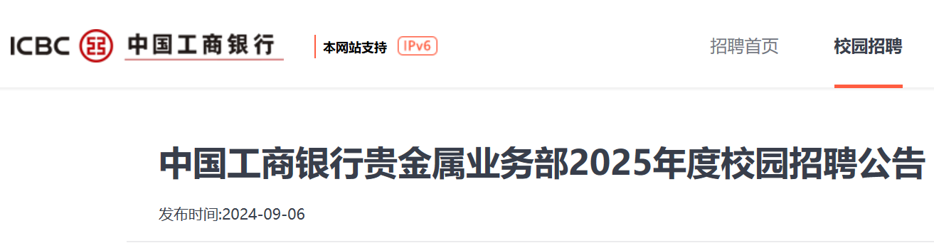 2025年度中國(guó)工商銀行貴金屬業(yè)務(wù)部校園招聘公告已發(fā)布,網(wǎng)上報(bào)名時(shí)間為2024年9月6日-10月10日?,F(xiàn)將招聘公告原文發(fā)布如下: