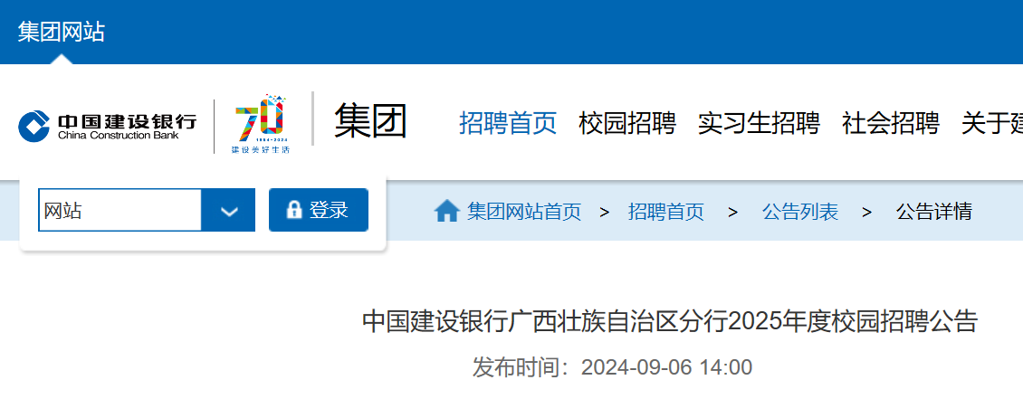 2025年度中國建設(shè)銀行廣西壯族自治區(qū)分行校園招聘公告已發(fā)布,報(bào)名截止時(shí)間為2024年10月18日24點(diǎn)(北京時(shí)間)?,F(xiàn)將招聘公告原文發(fā)布如下: