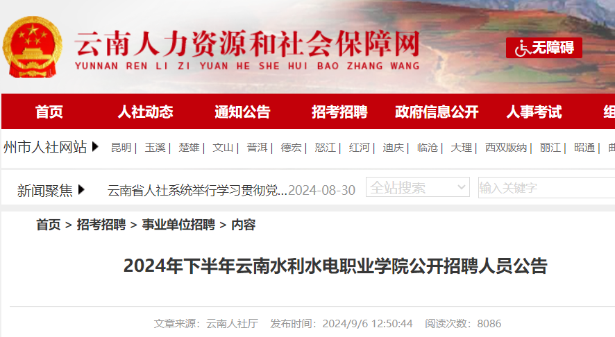 小編根據(jù)云南水利水電職業(yè)學(xué)院發(fā)布“2024年下半年云南水利水電職業(yè)學(xué)院公開招聘人員公告”得知,2024下半年云南水利水電職業(yè)學(xué)院公開招聘人員38人,報(bào)名時(shí)間9月19日至25日。
