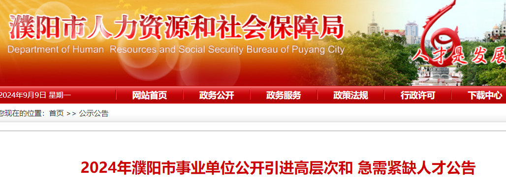 (二)《2024年濮陽市事業(yè)單位公開引進(jìn)高層次和急需緊缺人才公告》及相關(guān)信息在招聘指定網(wǎng)站發(fā)布,不再采取其他方式通知每位報考人員。濮陽市人力資源和社會保障局網(wǎng)(http://pyrs.puyang.gov.cn)為本次公開引進(jìn)的指定網(wǎng)站。