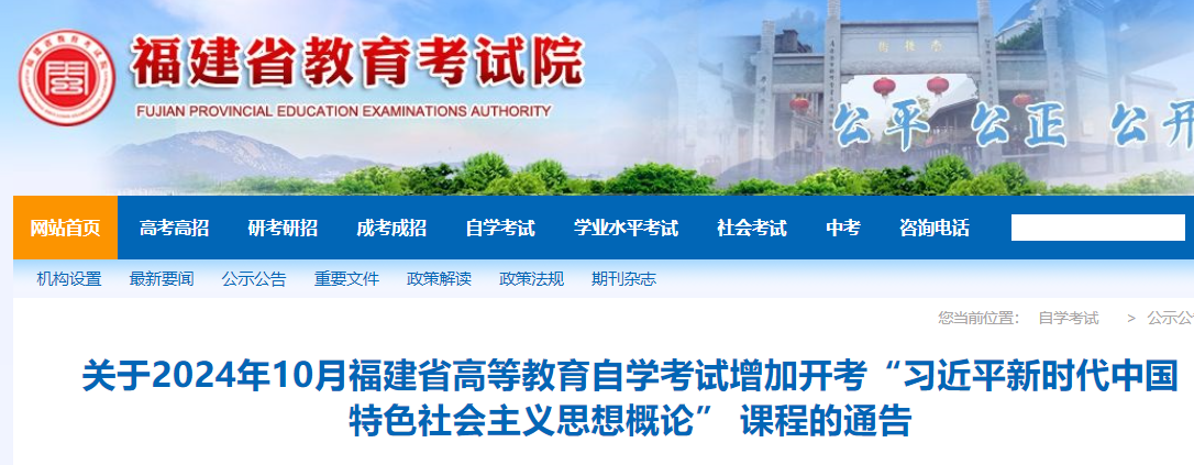 從福建省教育考試院了解到,2024年10月福建自考增加開考“習(xí)近平新時代中國特色社會主義思想概論” 課程的通告已公布,具體如下: