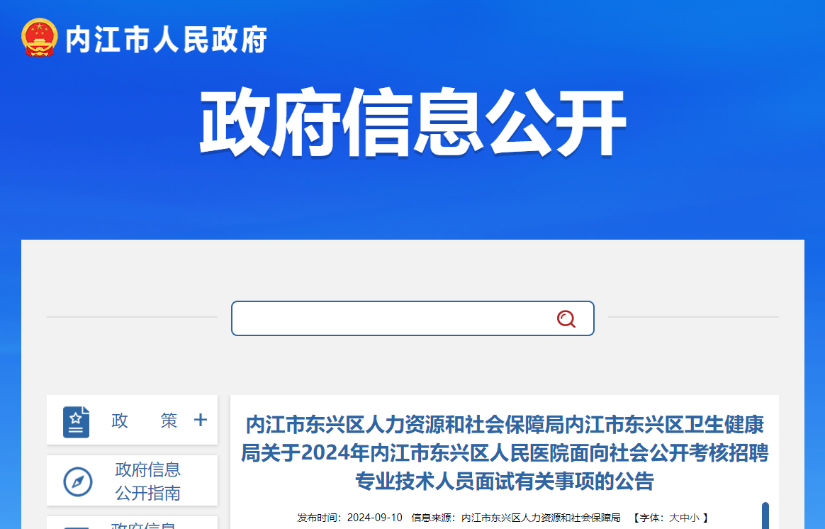 2024年四川內(nèi)江市東興區(qū)人民醫(yī)院面向社會公開考核招聘專業(yè)技術(shù)人員面試有關(guān)事項公告已發(fā)布,面試時間:2024年9月21日(星期六)。現(xiàn)將原文發(fā)布如下:
