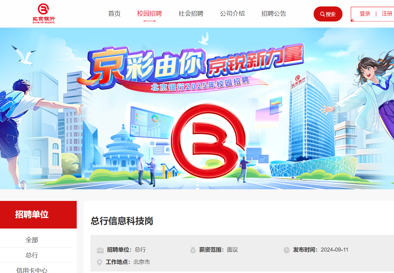 2025年北京銀行總行信息科技部門校園招聘公告已發(fā)布,報名截止日期:2024年10月13日?,F(xiàn)將招聘公告原文發(fā)布如下: