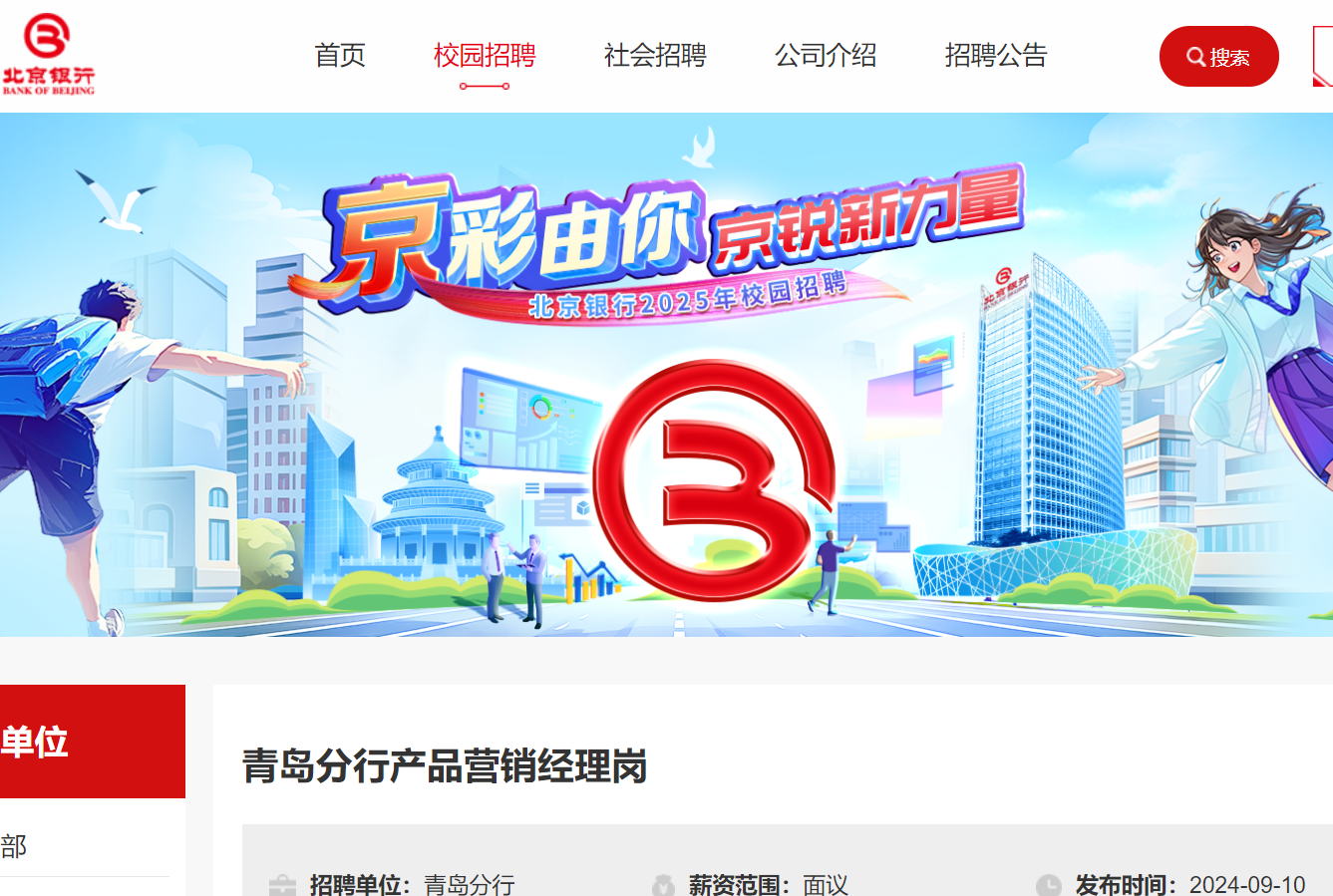 2025年北京銀行山東青島分行產(chǎn)品營銷經(jīng)理崗校園招聘公告已發(fā)布,報名截止日期:2024年10月13日。現(xiàn)將招聘公告原文發(fā)布如下: