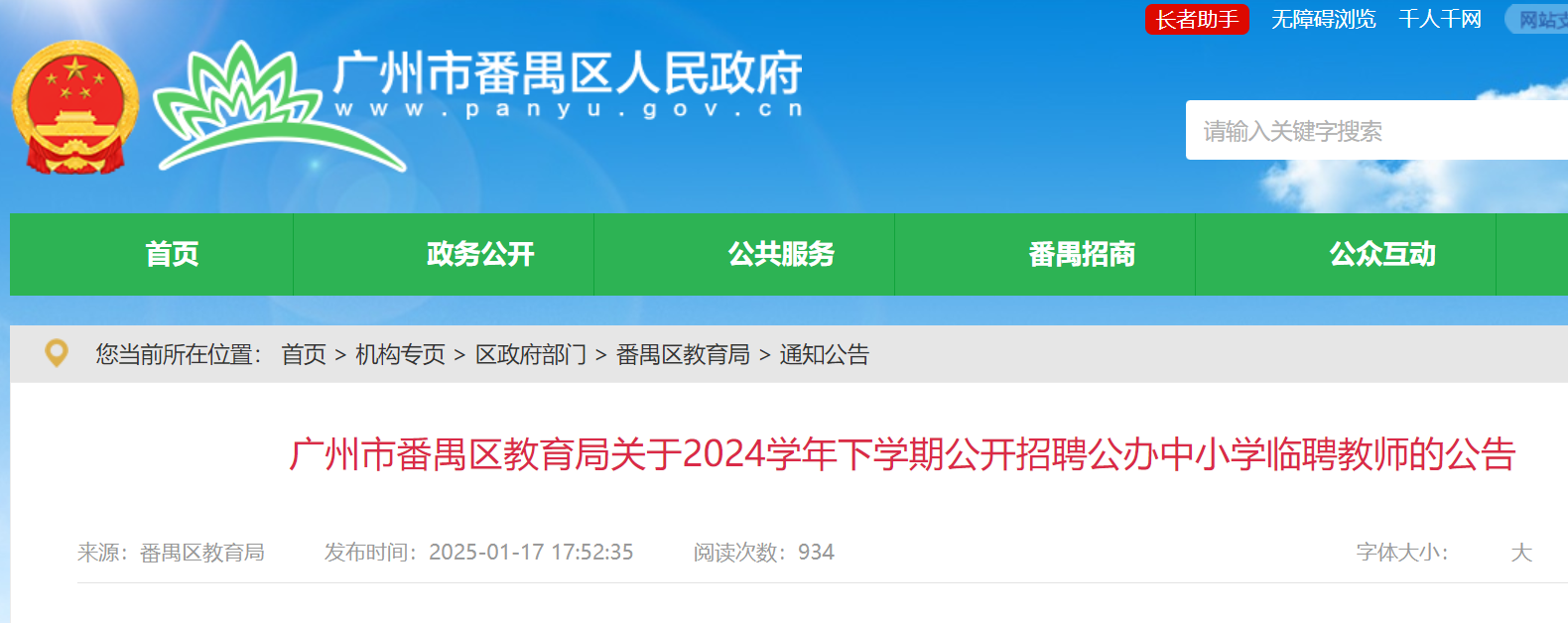 2024學(xué)年下學(xué)期廣東廣州市番禺區(qū)教育局公開招聘公辦中小學(xué)臨聘教師公告已發(fā)布,報(bào)名時(shí)間:2025年1月22日(星期三)上午9∶00-12:00時(shí)。現(xiàn)將招聘公告原文發(fā)布如下: