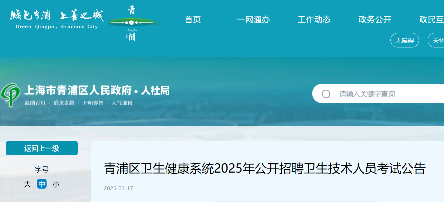 2025年上海市青浦區(qū)衛(wèi)生健康系統(tǒng)公開招聘衛(wèi)生技術(shù)人員考試公告已發(fā)布,報名時間:1月18日8:00起至1月31日16:00?,F(xiàn)將招聘公告原文發(fā)布如下: