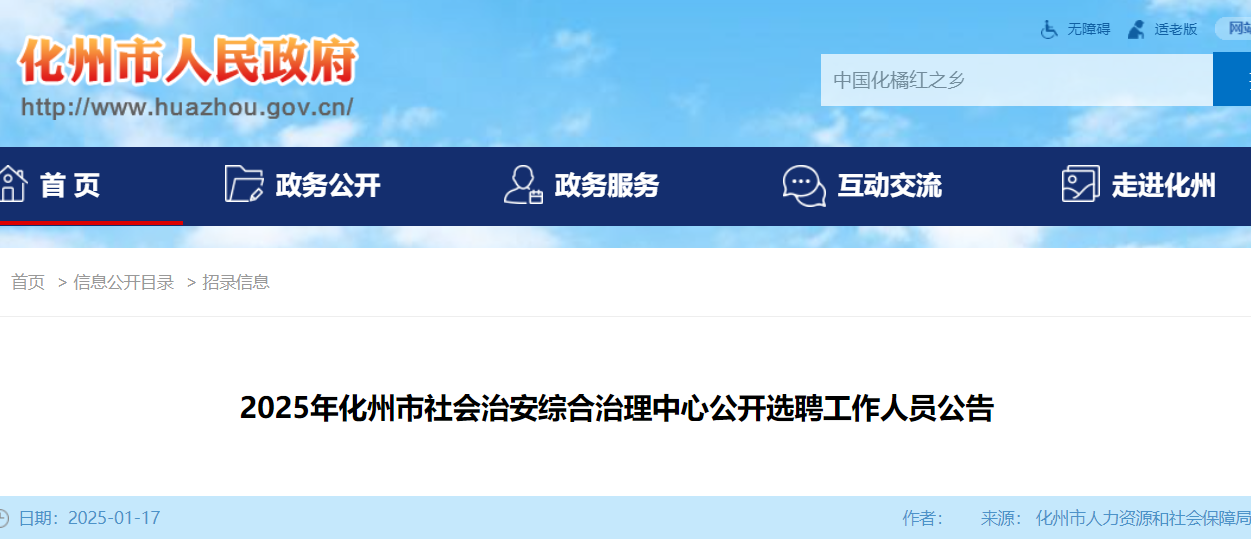 小編根據(jù)化州市人力資源和社會(huì)保障局發(fā)布”2025年化州市社會(huì)治安綜合治理中心公開選聘工作人員公告“得知,2025廣東茂名市化州市社會(huì)治安綜合治理中心選聘6人,報(bào)名時(shí)間2025年1月21日至26日。