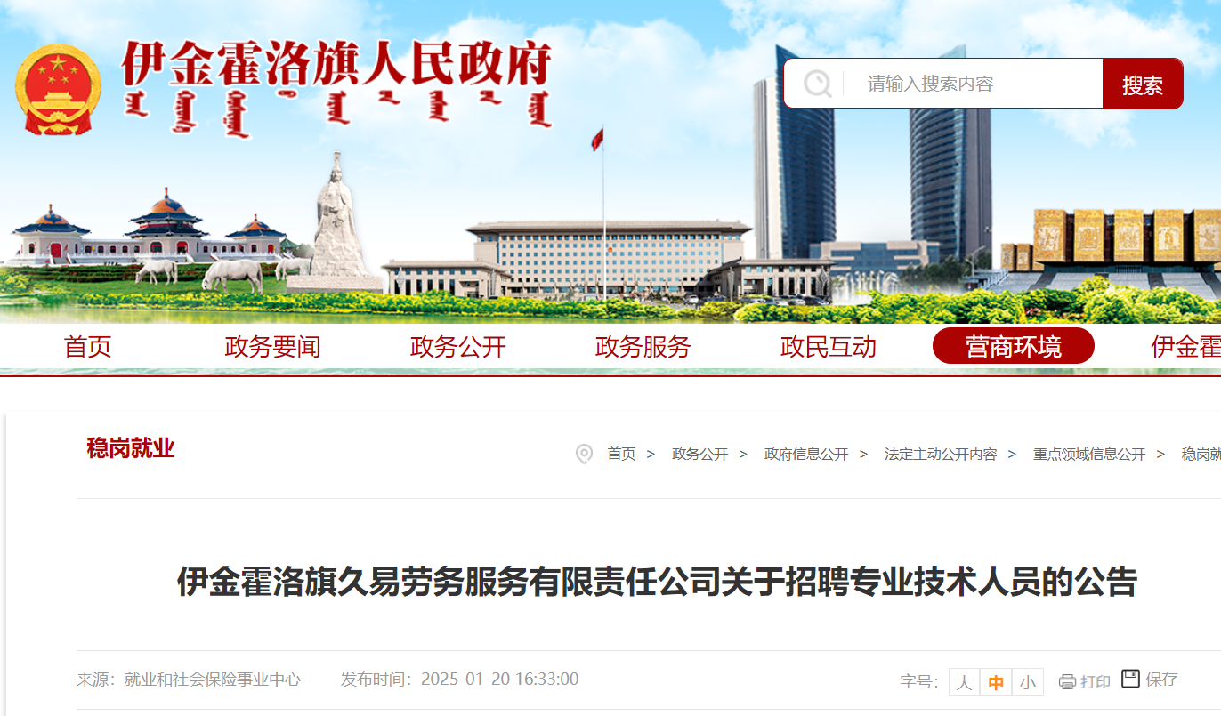 2025年內(nèi)蒙古鄂爾多斯伊金霍洛旗久易勞務(wù)服務(wù)有限責(zé)任公司招聘專(zhuān)業(yè)技術(shù)人員公告已發(fā)布,報(bào)名時(shí)間:2025年1月20日-1月27日8:00-17:00?,F(xiàn)將招聘公告原文發(fā)布如下: