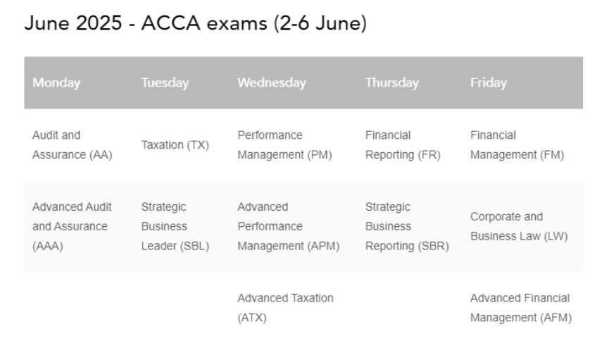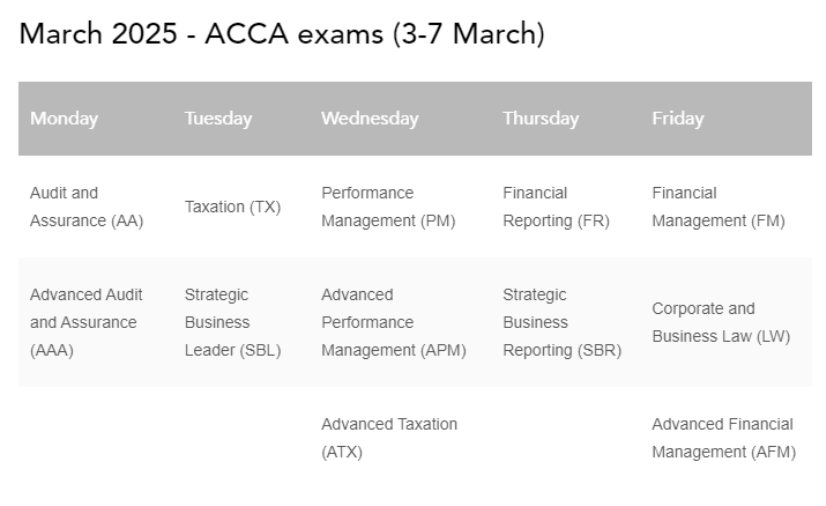 3月考試科目:3月3日(周一):Audit and Assurance (AA)、Advanced Audit and Assurance (AAA);3月4日(周二):Taxation (TX)、Strategic Business Leader (SBL);3月5日(周三):Performance Management (PM)、Advanced Performance Management (APM)、Advanced Taxation (ATX);3月6日(周四):Financial Reporting (FR)、Strategic Business Reporting (SBR);3月7日(周五):Financial Management (FM)、Corporate and Business Law (LW)、Advanced Financial Management (AFM)。