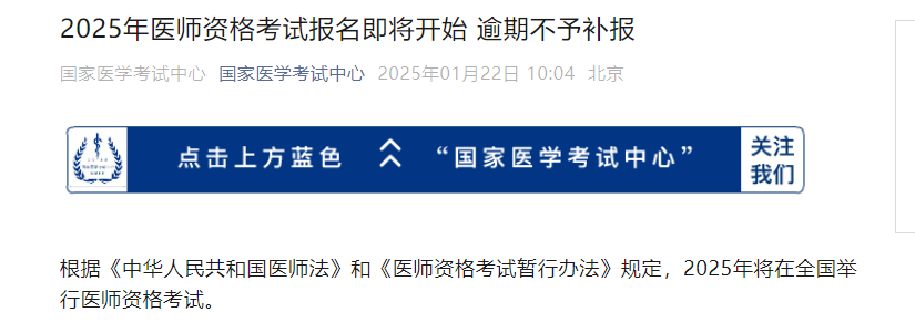 從國(guó)家醫(yī)學(xué)考試中心獲悉,2025年醫(yī)師資格考試報(bào)名即將開(kāi)始!逾期不予補(bǔ)報(bào),具體詳情如下: