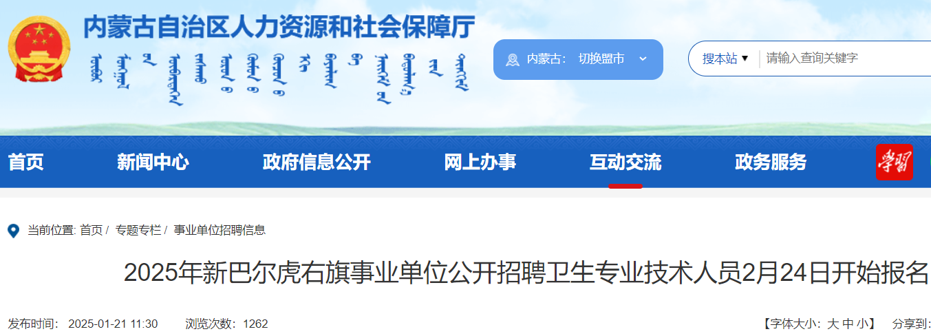 小編根據(jù)內(nèi)蒙古自治區(qū)人力資源社會保障廳發(fā)布“2025年新巴爾虎右旗事業(yè)單位公開招聘衛(wèi)生專業(yè)技術(shù)人員2月24日開始報名”得知,2025年內(nèi)蒙古呼倫貝爾新巴爾虎右旗事業(yè)單位招聘衛(wèi)生專業(yè)人員報名時間為2月24日,開始